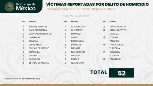 El Gobierno de México reportó un total de 52 víctimas de homicidio en todo el país durante el viernes 13 de marzo, de acuerdo con cifras preliminares elaboradas a partir de información proporcionada por fiscalías estatales y dependencias federales encargadas de seguridad.